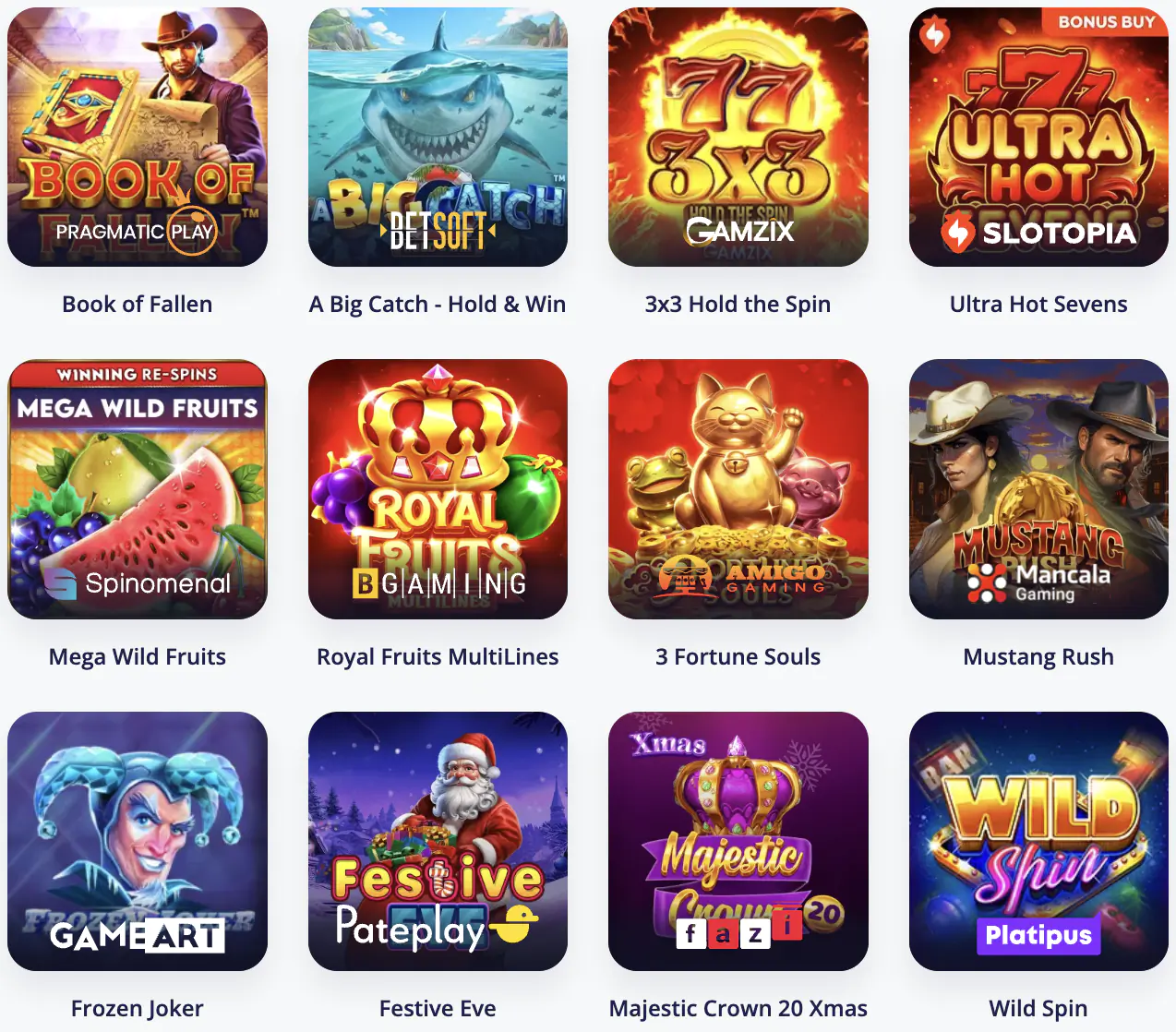 Bekannte Titel: Book of Dead (Play’n GO), Sweet Bonanza (Pragmatic Play), Gonzo’s Quest (NetEnt) und Joker Stoker (Endorphina).